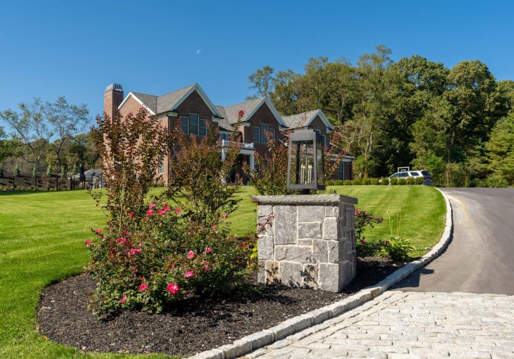 A light post at the entrance to a driveaway featuring Pangaea’s® Diamond River 3 Course Ashlar.
