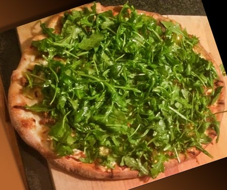 - Dress a bowl of arugula lightly with olive oil and red wine vinegar; put it on top of the hot pizza and let set.